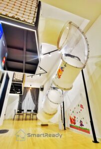 Comes with an Indoor Playground with a curved slide. Decorated with Winnie the Pooh theme.